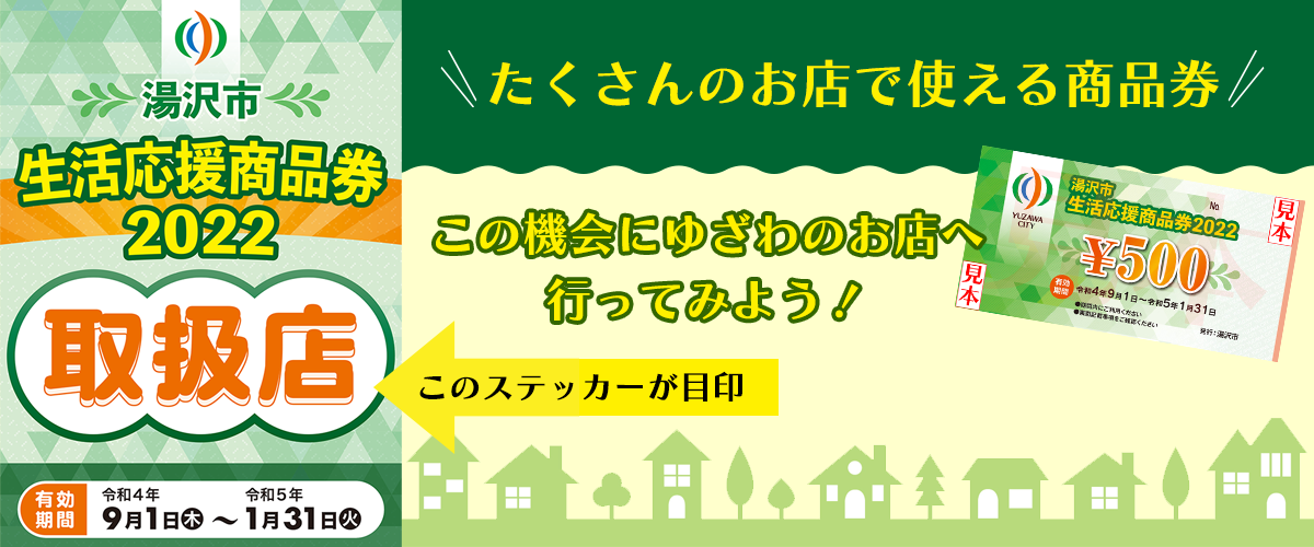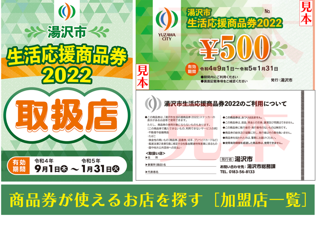 | 利用方法 | 「湯沢市生活応援商品券2022」取扱加盟店のステッカー表示がある店舗でのみ利用可能。 ※一部、商品券が利用できないものがあります ※おつりは出ません |